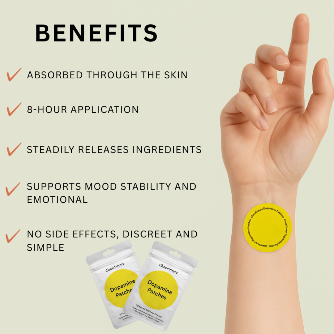 Support your mental wellness effortlessly with Dopamine Patches. Boost mood, enhance focus, and stay calm and balanced—all with convenient, vegan, plant-based patches for a brighter, sharper, and more positive day.