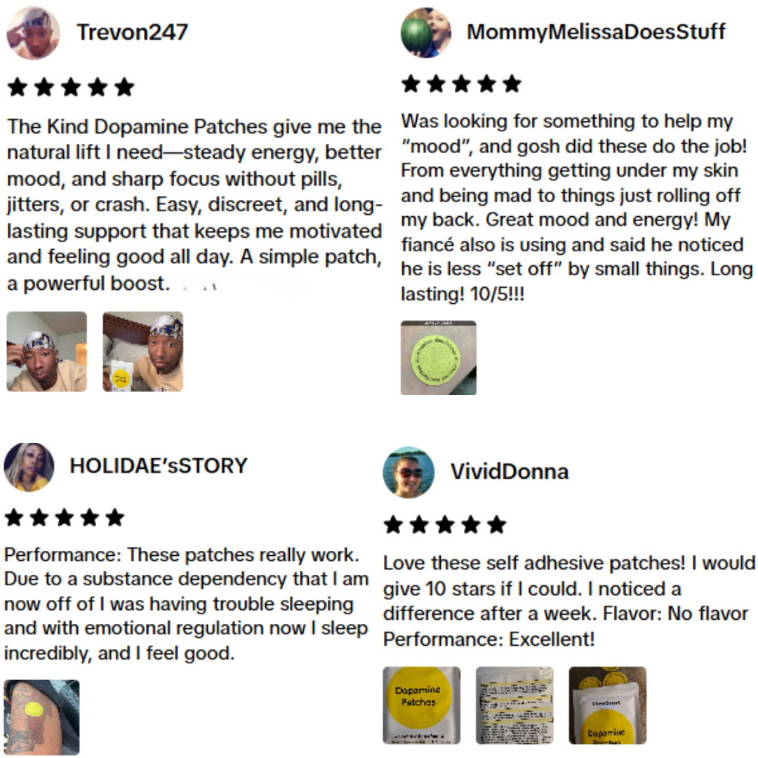 Sophia M.Verified BuyerWorth every penny.Dopamine Patches help me stay calm and balanced even on stressful days. I feel more emotionally stable and less overwhelmed.Dopamine Patches Was this helpful? 0 0