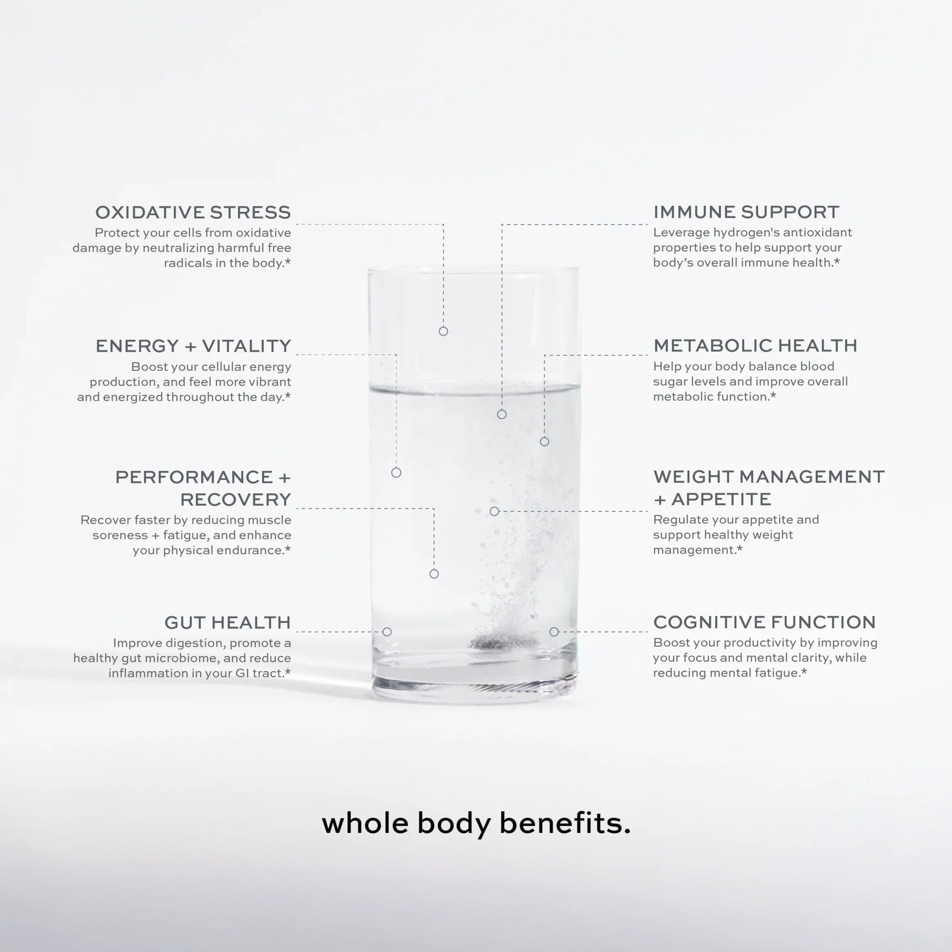 Hydrogen is the smallest molecule in the universe, but its impact on your body is huge. Due to its small molecular size, hydrogen gas is highly bioavailable, and can easily penetrate your cells and mitochondria to provide deep cellular support—helping you feel and function at your best. Molecular hydrogen is also a powerful antioxidant that helps neutralize harmful free radicals and reduce oxidative stress. Backed by extensive research, it has been shown to improve energy levels, mental clarity, energy, metabolic and gut health, and promote longevity.